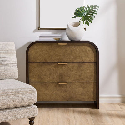 Handcrafted from oak veneer, this three-drawer accent chest captivates with its striking two-tone design and gracefully curved silhouette. The deep...