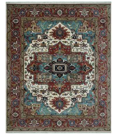 This 8x10 traditional Heriz Serapi wool area rug features a classic ivory, blue and rust color palette, skillfully hand-knotted to create an elegan...