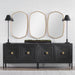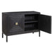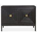 A contemporary geometric two door accent cabinet, constructed from deeply grained fir wood finished in a dark ebony stain, accented with brushed brass hardware. Has one fixed interior shelf.
