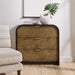 Handcrafted from oak veneer, this three-drawer accent chest captivates with its striking two-tone design and gracefully curved silhouette. The deep, rich walnut stained frame beautifully frames the drawer faces while the antique gold drawer pulls provide the perfect finishing touch.
